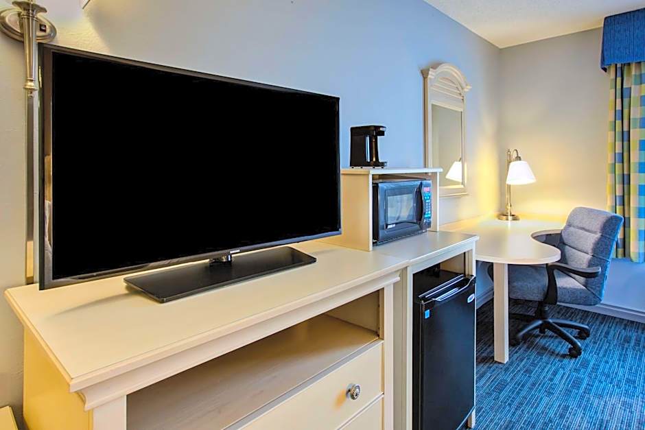 This room has a microwave, refrigerator, and flat-screen TV.